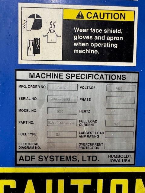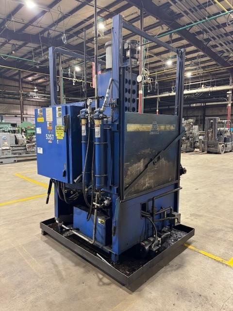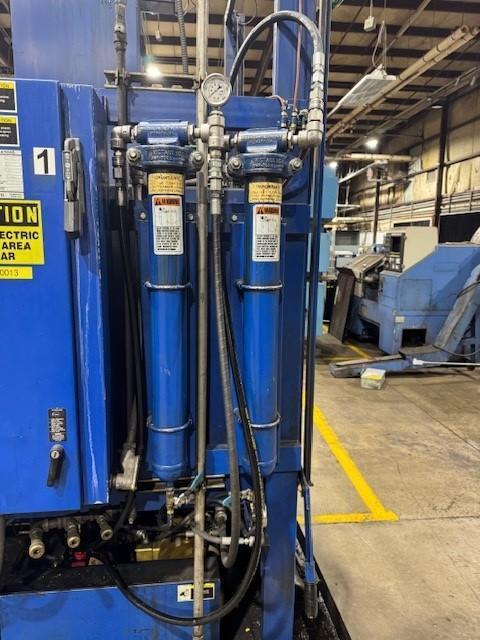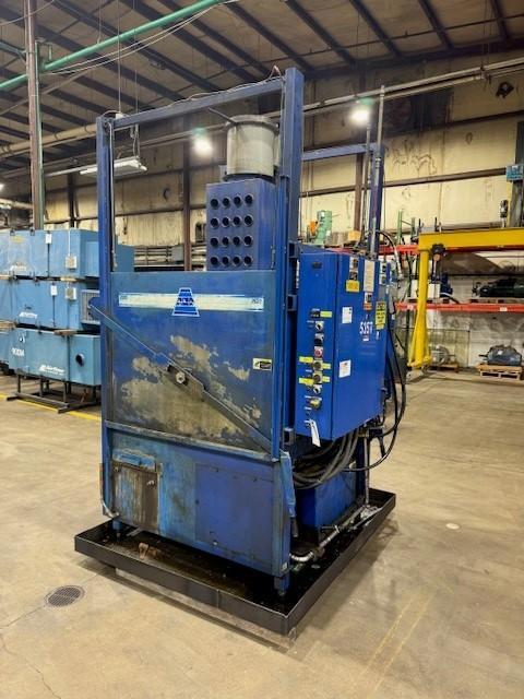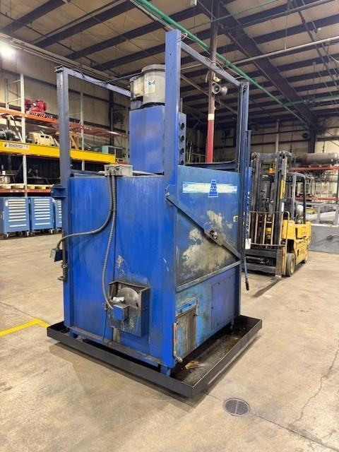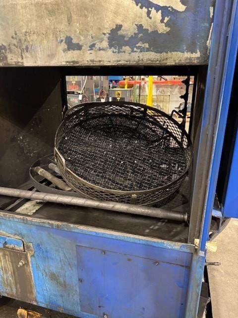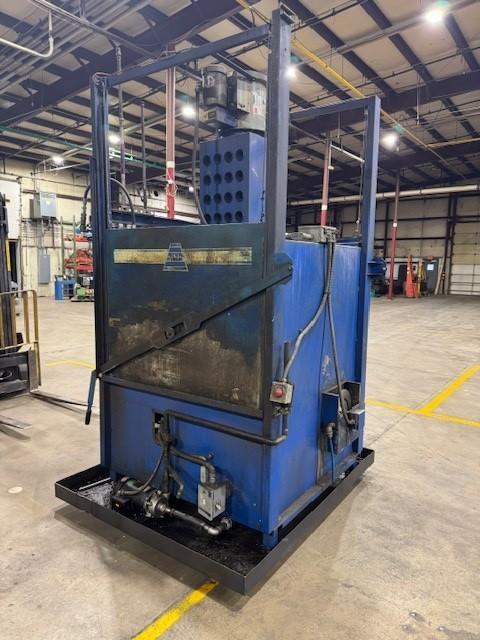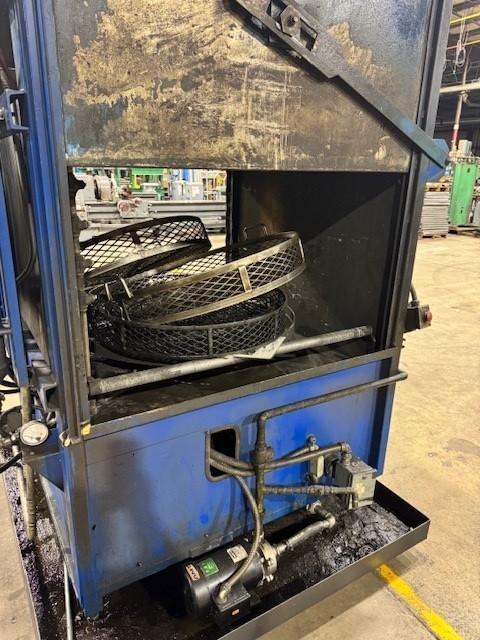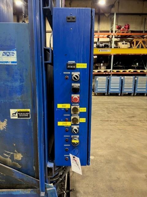 SPECIFICATIONS: PUMP ---------- 3 CYLINDER AXIAL DIAPHRAGM TYPE WITH BRASS HEAD TIMER --------- ELECTRONIC TIMER WITH PUSH BUTTON START/STOP HEATER -------- ELECTRIC STAINLESS STEEL PLUG, INCALOY ELEMENTS TEMP CONTROL -- THERMOSTAT CONTROL IN IMMERSION HEATER BOX FILTER -------- PRIMARY FILTER TRAY - 100 MICRON FELT FILTER. SECONDARY: HIGH PRESSURE CARTRIDGE TYPE 5 HP (1) CARTRIDGE: 10 HP (2) CARTRIDGES CONSTRUCTION: SPRAY CHAMBER & RESERVOIR TANK- 304 STAINLESS STEEL WELD IN FITTINGS- CARBON STEEL PLUMBING ------- BRASS, MALLABLE OR PLATED FITTINGS WASH WATER ----- STAINLESS STEEL NOZZLES TURNTABLE ------ CARBON STEEL STRUCTURE ------- CARBON STEEL PORTABLE -------- ALL MACHINES STATIONARY WITH FOUR ADJUSTABLE LEGS ROLLER TABLE ---- in X in X in CONTROLS -------- ALL 115 VOLT FUSED ELECTRICAL ENCLOSURE -- NEMA 12 MAX. TEMPERATURE- 160 DEGREES F BASKET SIZE ----- in BASKET MATERIAL - VINYL DIP COATED OVER CARBON STEEL, 3/4 in X #9 FLATTENED EXPANDED METAL TURNABLE ROTATION- 6 RPM. BELT DRIVEN BY GEAR MOTOR LOAD CAPACITY --- 500 LBS QUANTITY OF NOZZLES- MACHINE DIMENSIONS-- 44 in x 89 in x 134 in TALL NOTES: SPECIFICATIONS SUBJECT TO VERIFICATION DELIVERY: IMMEDIATE, SUBJECT TO PRIOR SALE