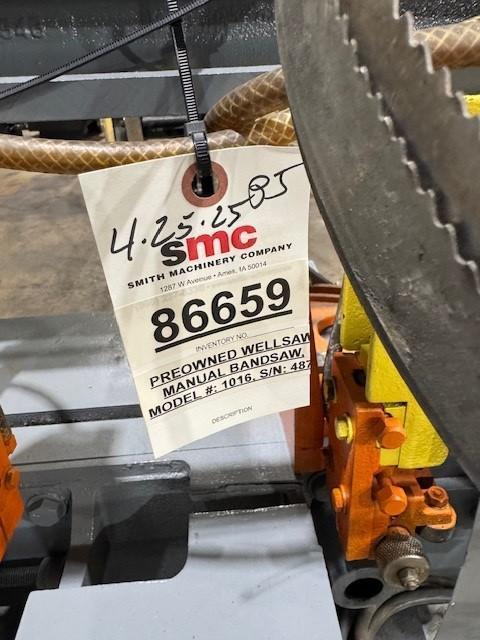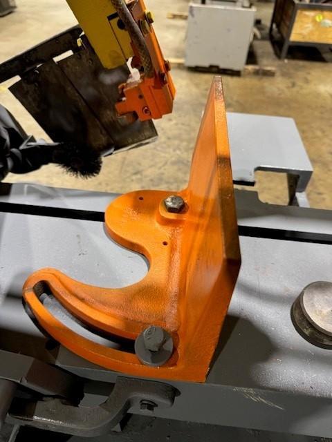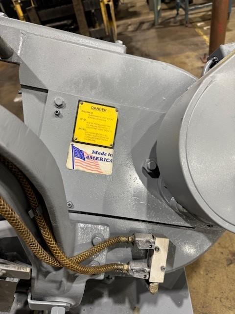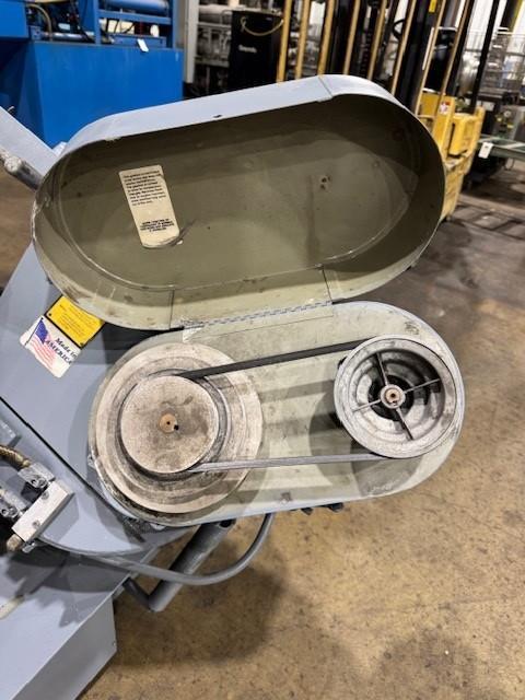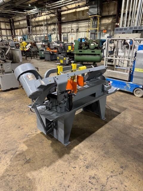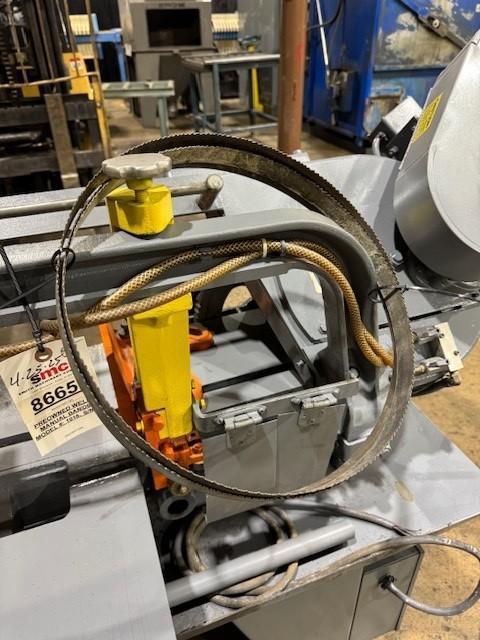 SPECIFICATIONS: CAPACITY: ROUND --------------------------------- 10.5 in FLAT ---------------------------------- 16.5 in RECTANGULAR --------------------------- 10 in x 16 in 45 DEGREE ANGLE ----------------------- 10 in H x 9 in BLADE SIZE ----------------------------- 1 in x .035 in x 11 ft6 in BLADE SPEEDS --------------------------- 50-100-175-275 FPM BLADE GUIDES --------------------------- CARBIDE GUIDES WITH ROLLERS BLADE TENSION -------------------------- MANUAL RITE-TENSION BLADE BRUSH------ MANUAL BACKSTOP---- COOLANT SYSTEM: TANK CAPACITY ------------------------- 8 GALLONS SUBMERSIBLE PUMP ---------------------- 115V/.6 AMP/170GPH DISCHARGE TABLE ------------------------ 12 in L X 7 5/8 in W VISE CONTROL --------------------------- MANUAL SCREW SWIVEL VISE ---------------------------- TO 45° FEED CONTROL --------------------------- ADJUSTABLE GRAVITY BAND WHEELS ---------------------------- 15 in DIAMETER BED HEIGHT ----------------------------- 29 in FLOOR AREA ----------------------------- 32 in W x 84 in L SHIPPING DIMENSIONS -------------------- 38 in X 88 in X 64 in H SHIPPING WEIGHT (APPROX.) -------------- 930 LBS. ELECTRIC: 208v-230v/3ph RPM: 1725 MOTOR: 2hp NOTES: Has a Blade with it. SPECIFICATIONS SUBJECT TO VERIFICATION DELIVERY: IMMEDIATE, SUBJECT TO STOCK
