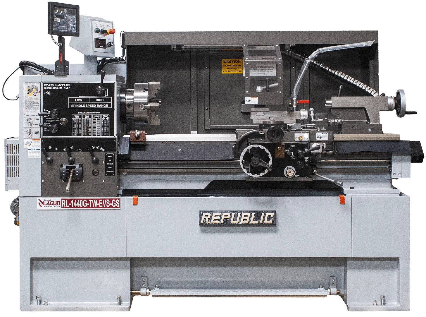 • HEADSTOCK MOUNTED RPM READOUT WITH SPINDLE SPEED CONTROL DIAL. STANDARD ON ALL EVS LATHES.